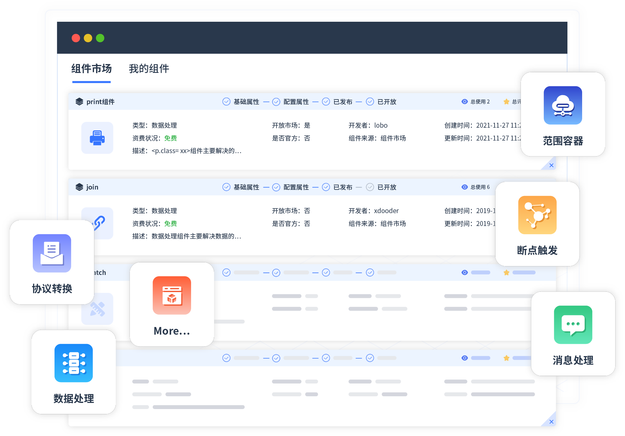 针对集成场景,,,,CGPAY钱包提供组件市场,,,,例如协议转换、、、消息处理、、文件操作等。。除平台提供的组件外,,,,客户可以自定义所需组件。。。。